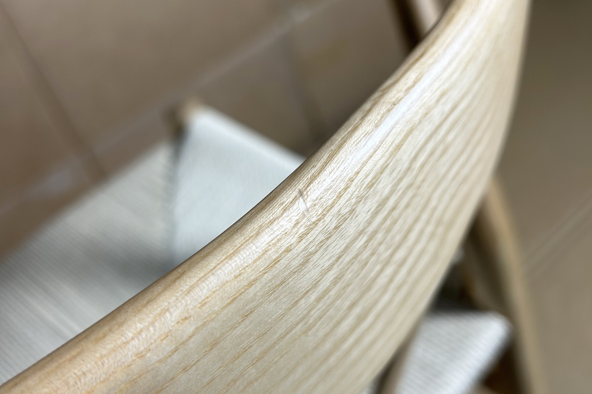 食卓でゆったりとした時間を過ごすために、アームレストは少し長めにデザインされています。座ってくつろぐ時はもちろん、手をかけて立ち上がる時にも体をサポートします。また、アームのジョイント部分を無くして無垢材1本の曲木で仕上げたことにより、すっきりとした美しさと強度の両立を実現しました。