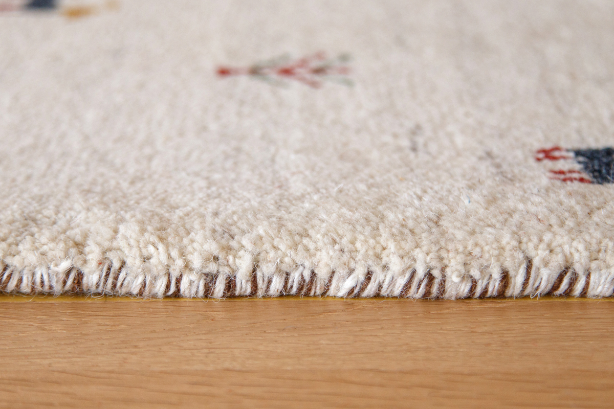 ギャッベとはペルシャ語で目が粗くて毛足が長い絨毯を意味する。ルーツはイラン・イスラム共和国の南西部に位置するシラーズ州を遊牧する部族カシュガイ族、ルリ族などによって織られる遊牧民の手織りの絨毯のことを指します。羊の毛をざっくりと織ってふかふかに仕上げているので厚みと重みがあり、へたりにくいのがポイント。