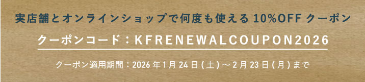ご注文画面(3.注文内容確認)のクーポンコード欄に「KFRENEWALCOUPON2026」を入力してお支払い画面にお進みください。